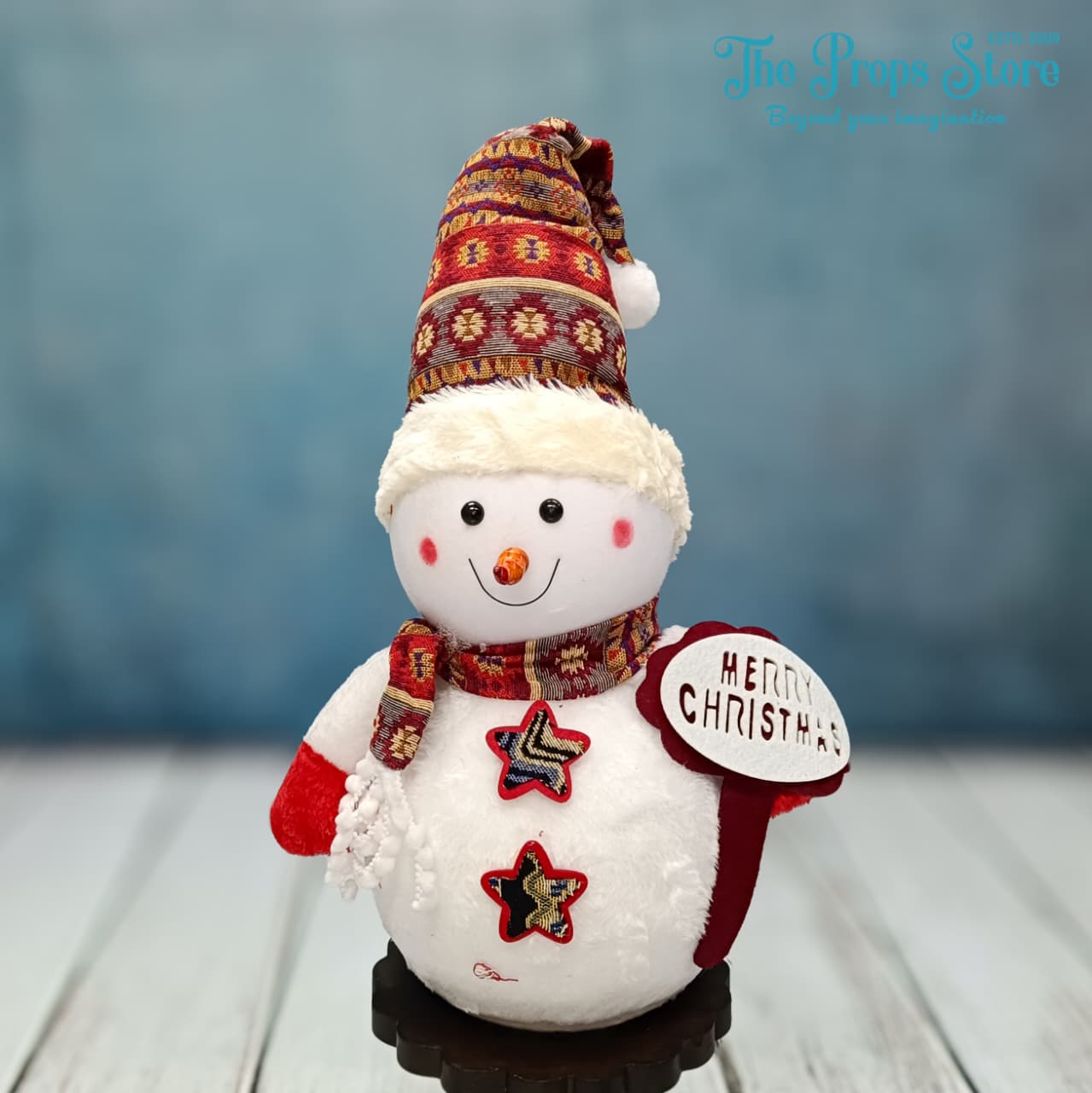 A cute Christmas Snowman prop 47x34x34 perfect for newborn and kids’ photoshoots. Features a soft white body, colorful winter hat, matching scarf, and festive detailing—ideal for Christmas and winter-themed studio setups.