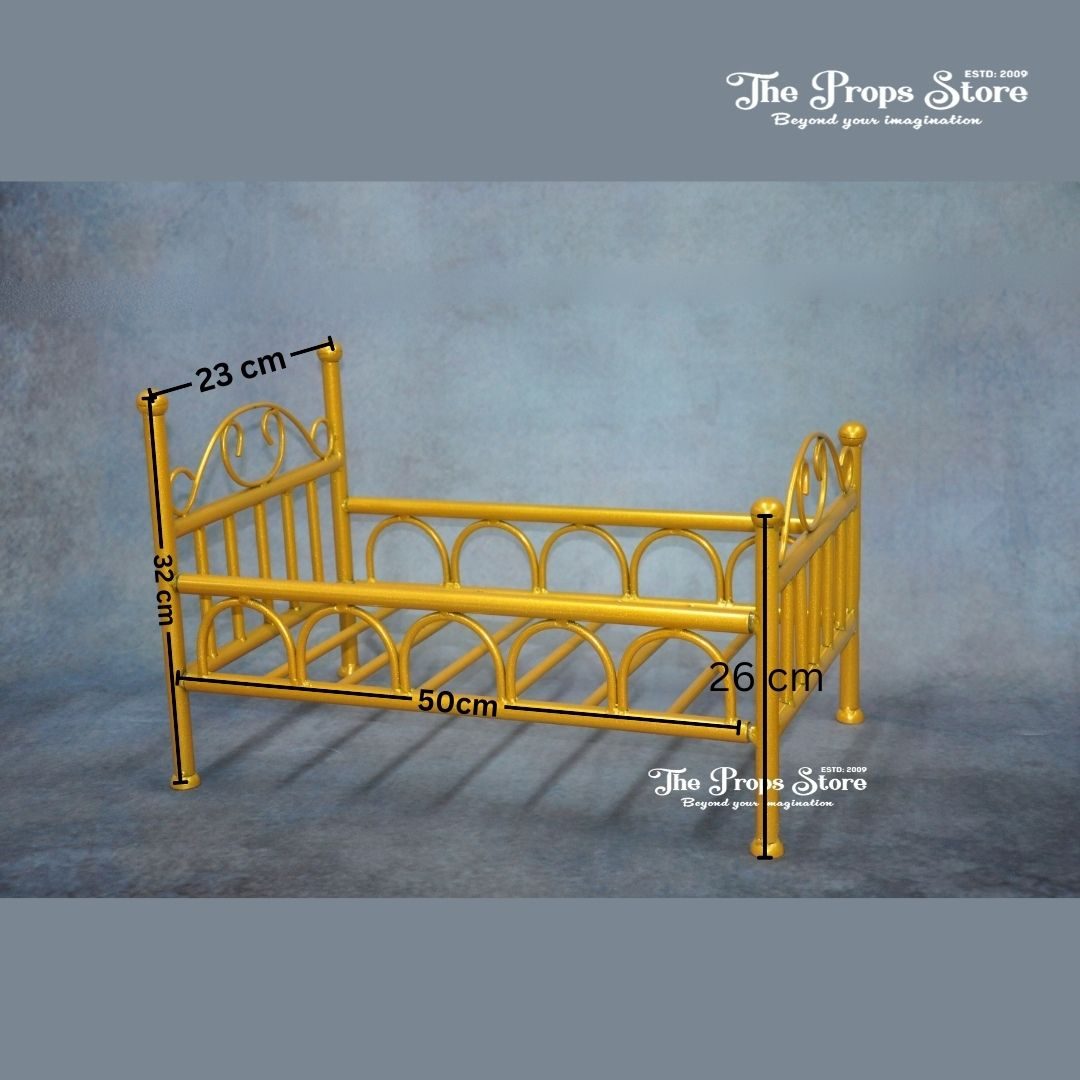 Elegant metal baby bed prop in golden finish – perfect for newborn and kids’ photography. Size: 50 cm (L) x 26 cm (W) x 32 cm (H)